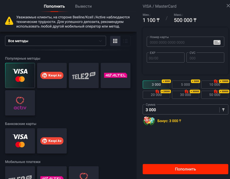 | Visa / MasterCard / Kaspi.kz | Депозит / Вывод | 1 100 ₸ – 500 000 ₸ | 3 000 ₸ – 1 500 000 ₸ | До 24 часов |