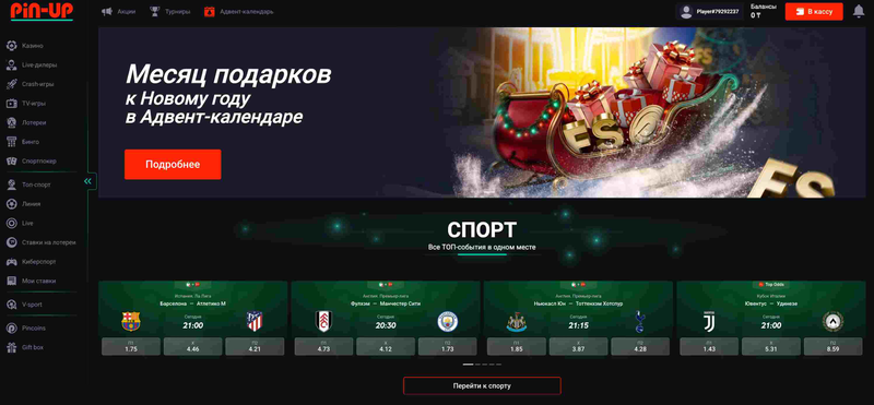 Pin Up KZ – удобный и логично устроенный сайт: слева фиксированное меню разделов, в центре лента с лучшими играми и текущими акциями. Навигация простая, потому что нужные разделы открываются в один клик, касса и поддержка доступны из любой страниц: